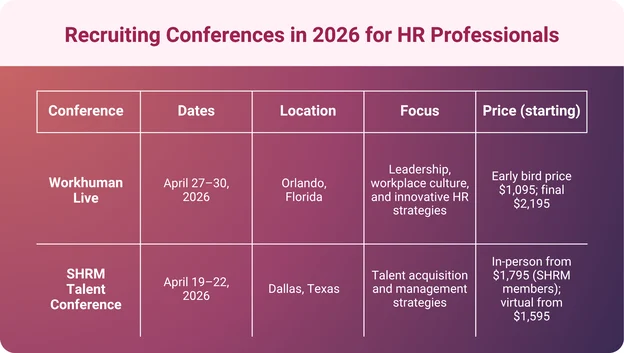 To save you time, we’ve rounded up the best recruiting conferences of 2026. From large-scale global summits to niche talent acquisition events, each one is designed to help you build skills, expand your network, and future-proof your recruiting career.